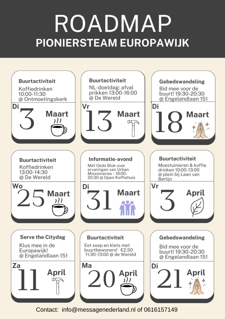 Momenteel zitten we in de beginfase om een Eden-team te lanceren in Schalkwijk, Haarlem in samenwerking met 2 kerken. Wilt u eens een kijkje komen nemen? Doe mee aan één van de volgende activiteiten: